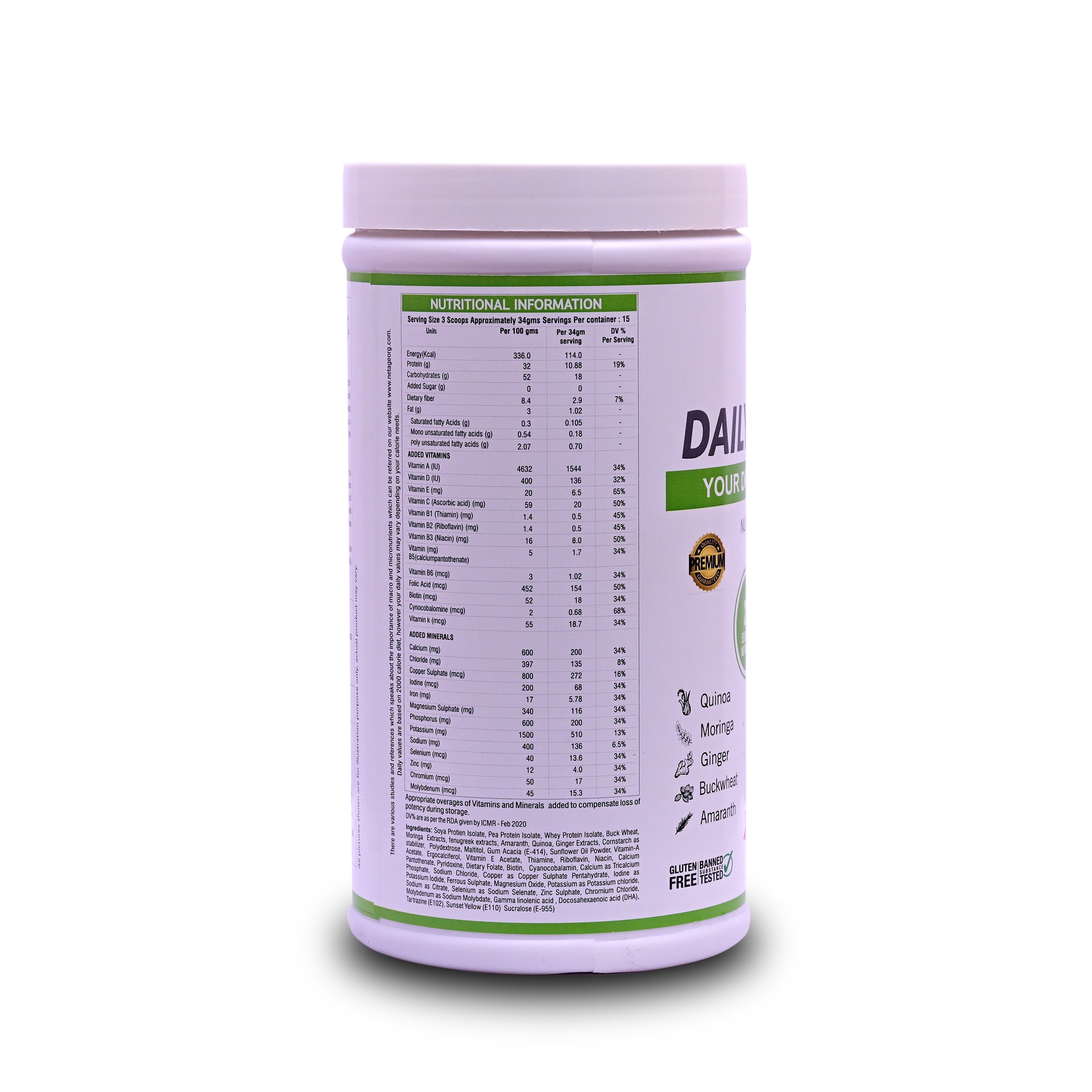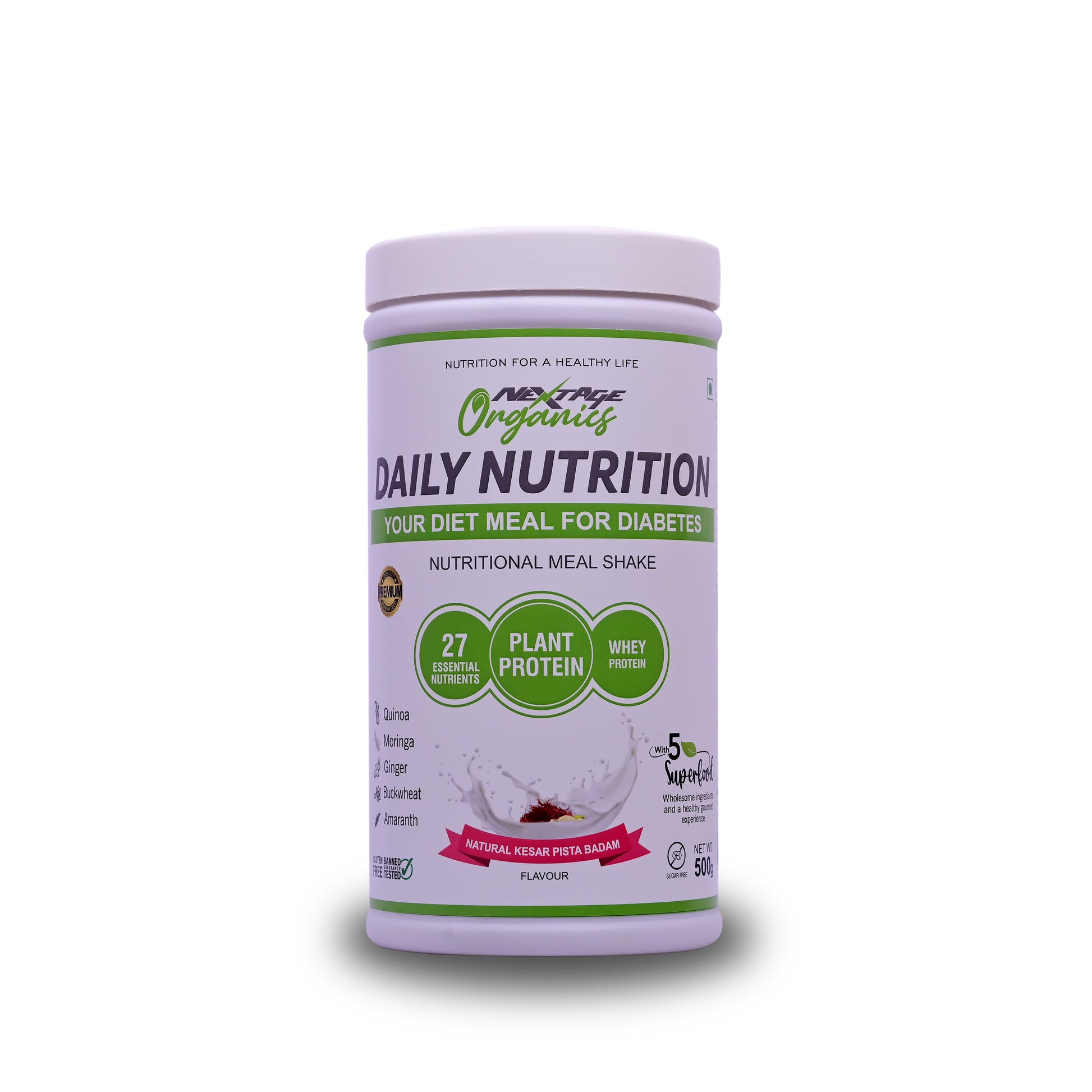 Daily Nutrition is a specially formulated nutritional meal shake designed to provide complete balanced nutrition, particularly for individuals managing diabetes. Packed with 27 essential nutrients, a blend of plant protein and whey protein, and enriched with the goodness of superfoods like quinoa, moringa, ginger, buckwheat, and amaranth, it offers wholesome nourishment in every scoop. This unique formulation helps maintain energy levels, supports healthy metabolism, and contributes to overall wellness while keeping dietary needs in mind. With its natural kesar pista badam flavor, it delivers a rich taste along with powerful nutrition, making it a convenient and health-focused choice for daily dietary support.